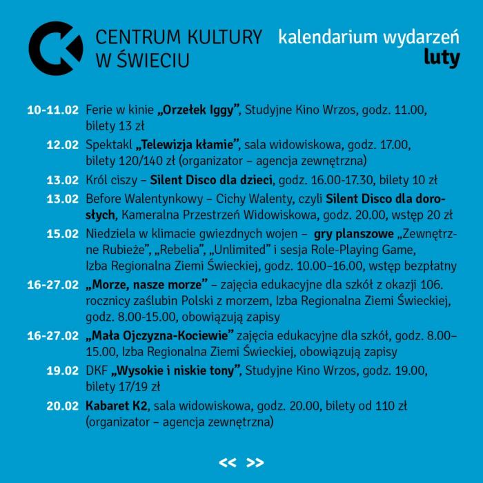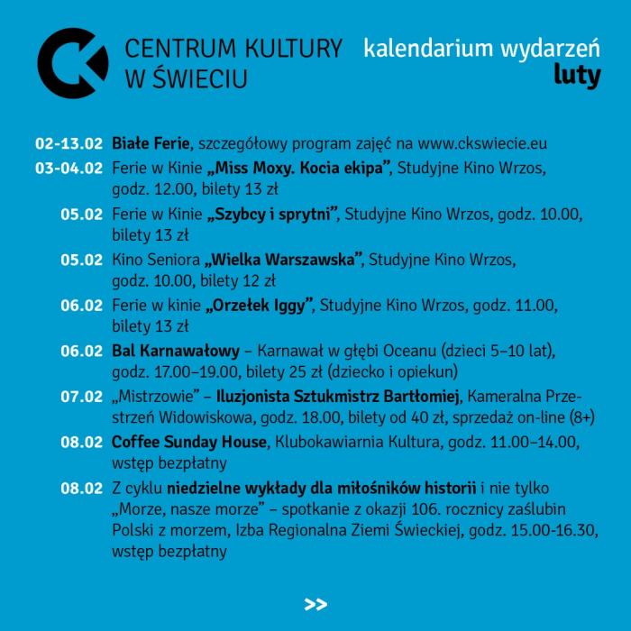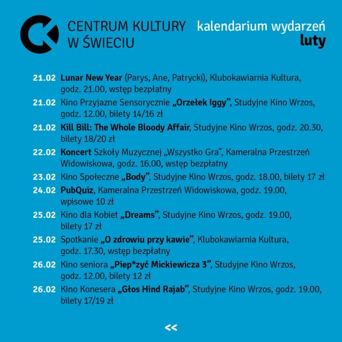 Centrum Kultury w Świeciu opublikowało harmonogram wydarzeń na luty