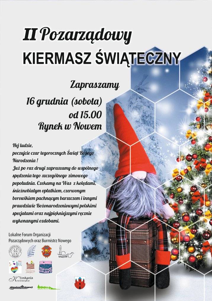Nowskie Forum Organizacji Pozarządowych zaprasza wszystkich mieszkańców na II Pozarządowy Kiermasz Świąteczny, który odbędzie się w sobotę 16 grudnia od 15:00 na Rynku w Nowem