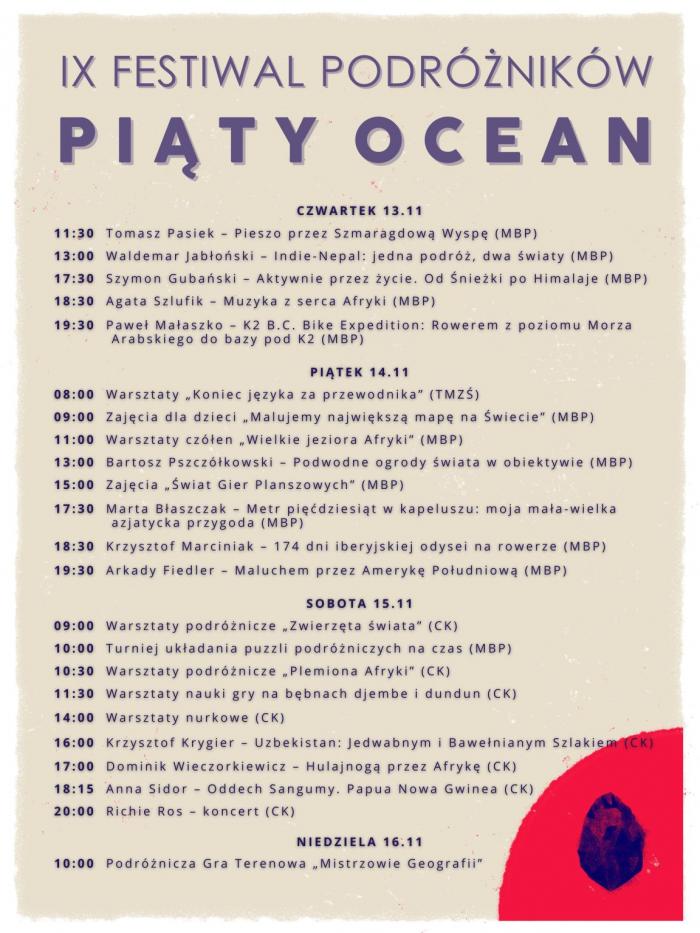 - Już po raz dziewiąty zabierzemy Was do fascynujących zakątków globu w ramach Festiwalu Podróżników Piąty Ocean – zapowiadają organizatorzy. - To będą cztery intensywne dni wypełnione spotkaniami podróżniczymi, warsztatami, muzyką świata i innymi inspirującymi aktywnościami. Warto zarezerwować trochę czasu i wybrać się na bliskie spotkanie ze Światem w Świeciu – dodają.