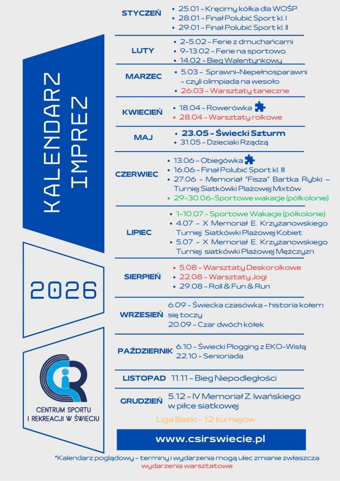 - Przed nami kolejny sezon pełen aktywności, które już od lat przyciągają uczestników w każdym wieku - informuje CSiR. - W przyszłym roku nie zabraknie zarówno sprawdzonych, lubianych imprez, jak i warsztatów czy programów dla dzieci i młodzieży – ferii, półkolonii i wakacyjnych zajęć. Wśród stałych wydarzeń znajdziecie m.in. popularne biegi, imprezy rowerowe, turnieje siatkarskie oraz rodzinne inicjatywy, które na stałe wpisały się w sportowy kalendarz naszego miasta. Te terminy możecie śmiało rezerwować już teraz.