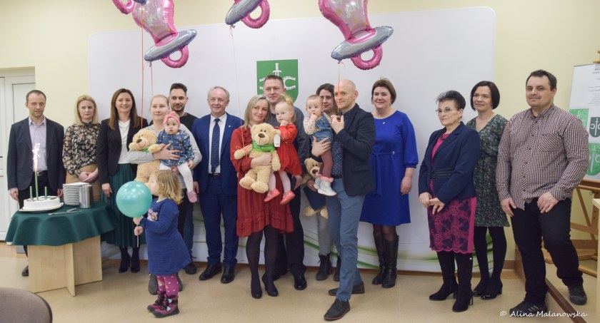 Burmistrz Dariusz Wądołowski wspólnie z wiceprzewodniczącą Rady Miejskiej Anną Dobaczewską wręczyli dzieciom pamiątkowe prezenty w postaci symbolicznej podkowy na szczęście i pluszowe misie. Był też tort i kącik zabaw.