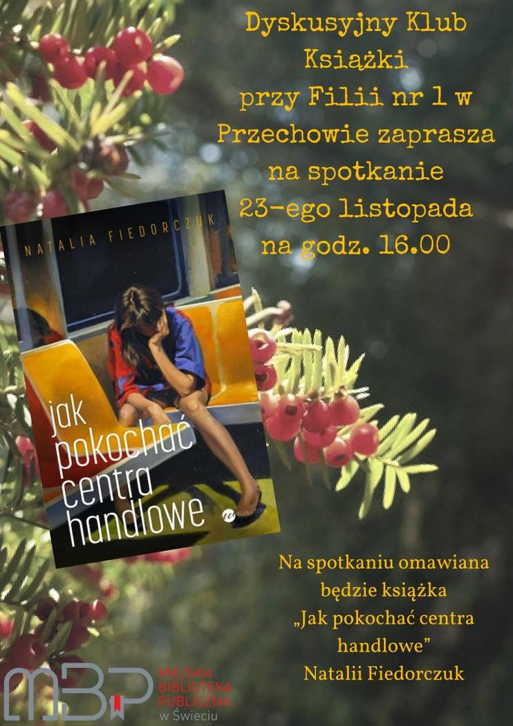 Biblioteka Publiczna w Świeciu zaprasza 23 listopada o godz. 16:00 na spotkanie DKK, które odbędzie się przy Filii nr 1 w Przechowie Na spotkaniu omawiana będzie książka Jak pokochać centa handlowe Natalii Fiedorczuk. Źródło: Biblioteka w Świeciu