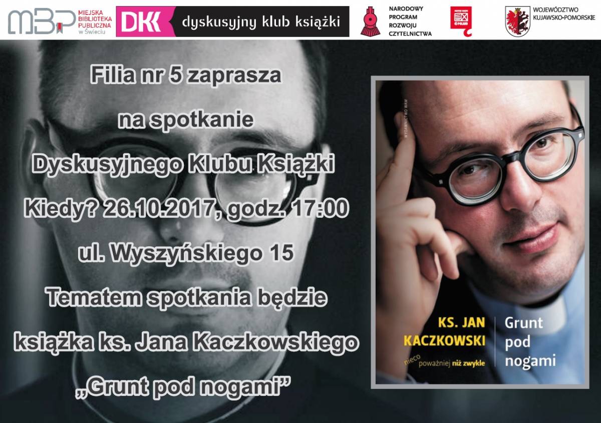 Filia nr 5 w Świeciu zaprasza 26 października o godz. 17:00 na spotkanie Dyskusyjnego Klubu Książki Tematem spotkania będzie książka ks. Jana Kaczkowskiego Grunt pod nogami Źródło: Biblioteka w Świeciu
