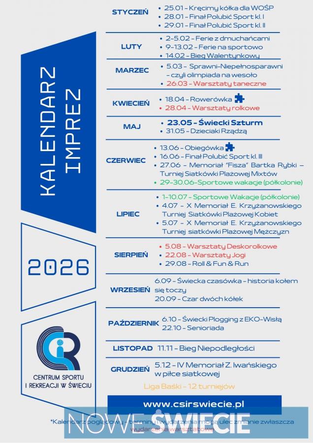 Kalendarz imprez 2026. CSiR Świecie przedstawia plan wydarzeń na przyszły rok