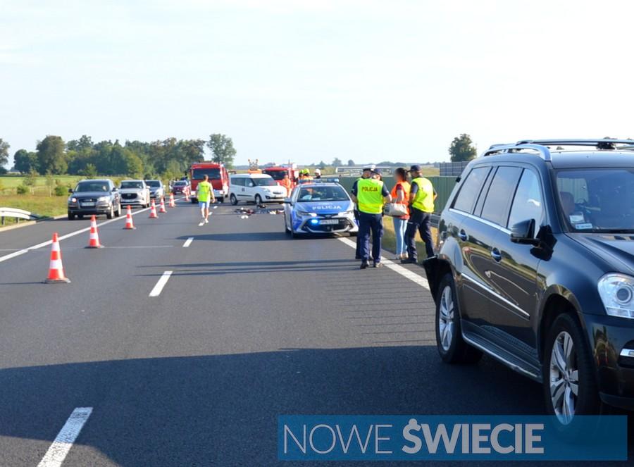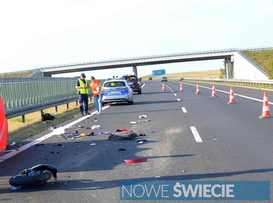 Galeria zdjęć z miejsca tragicznego wypadku drogowego na autostradzie A1 pomiędzy węzłami Warlubie a Kopytkowo, gdzie motocyklista zderzył się z mercedesem. Policjanci zabezpieczyli miejsce zdarzenia, wykonali oględziny pojazdów, a technik kryminalistyki dokumentację fotograficzną.