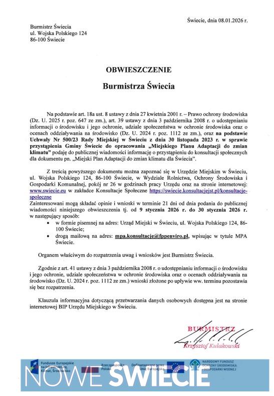 Miejski Plan Adaptacji do zmian klimatu dla Świecia. Obwieszczenie burmistrza
