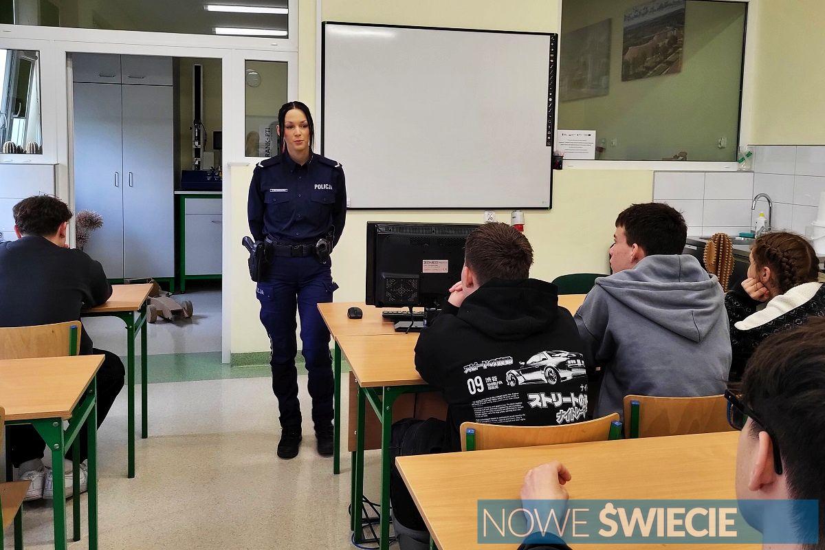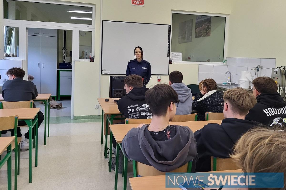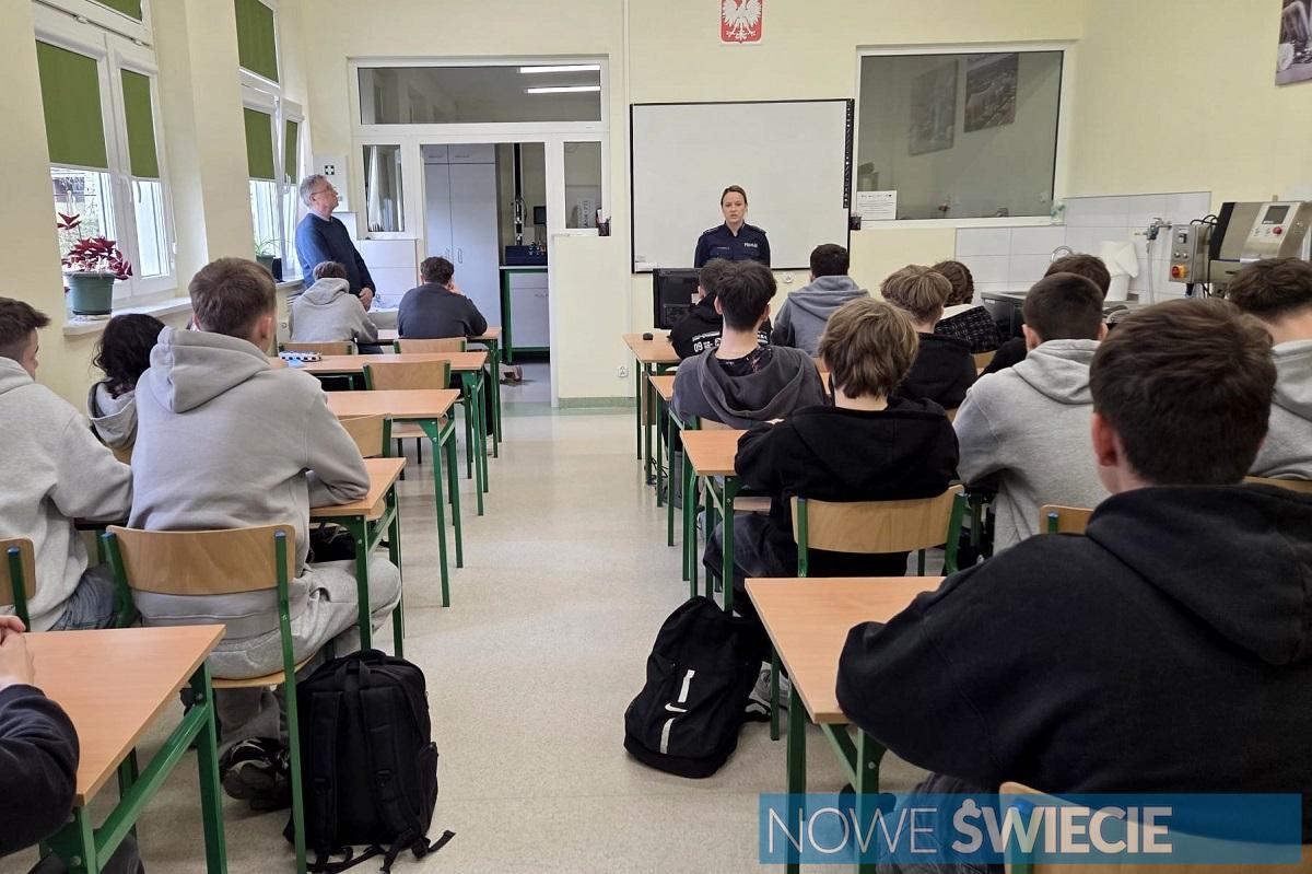 Zdjęcia Policja w Zespole Szkół Ogólnokształcących i Policealnych w Świeciu. Tematy: demoralizacja, wykroczenia i przestępstwa - fotorelacja
