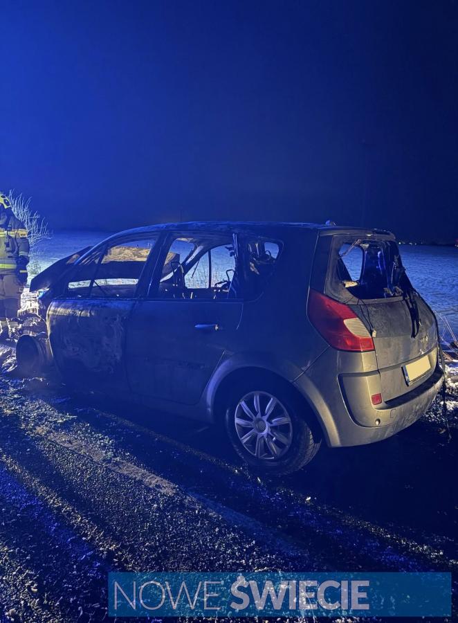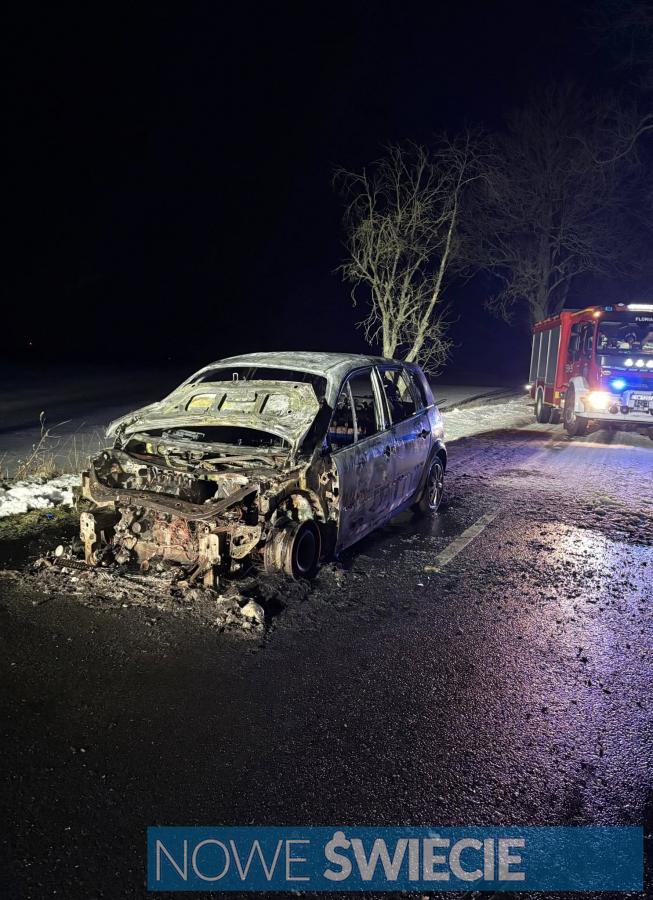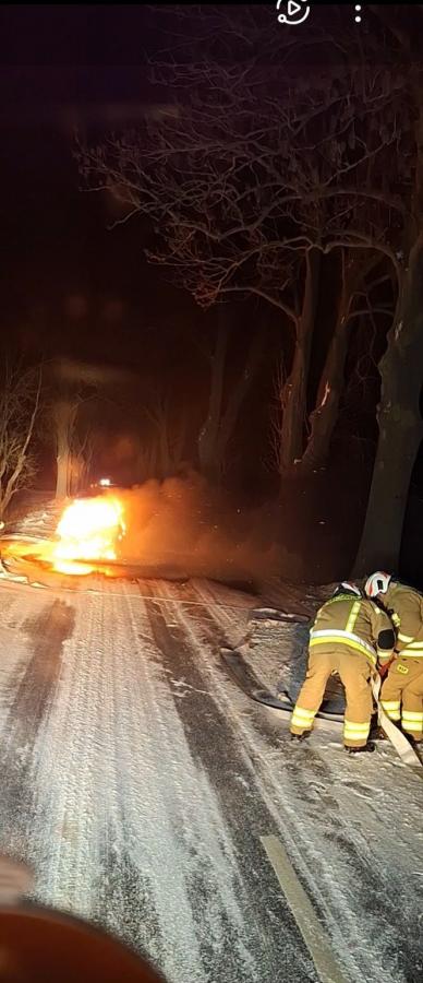 Pożar samochodu osobowego na drodze powiatowej. Nocna akcja służb