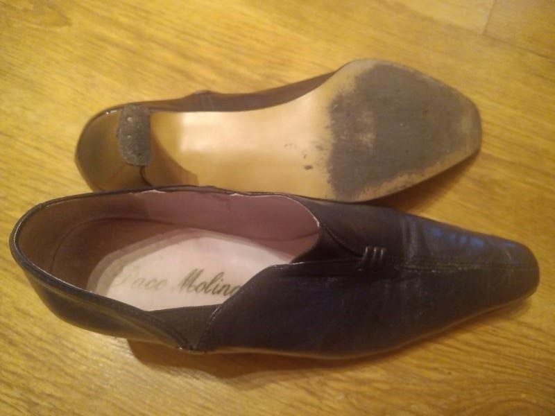 3) Granatowe półbuty firmy Paco Molina z naturalnej skóry na obcasie - słupku . Rozmiar 39, 6, 25 cm. Cena 10 zł.