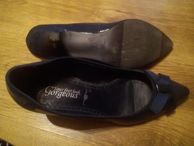 4) Granatowe lakierki szpilki firmy Gorgeous, obcas ok. 3 cm. Rozmiar 39, 6, 25 cm. Cena 10 zł.