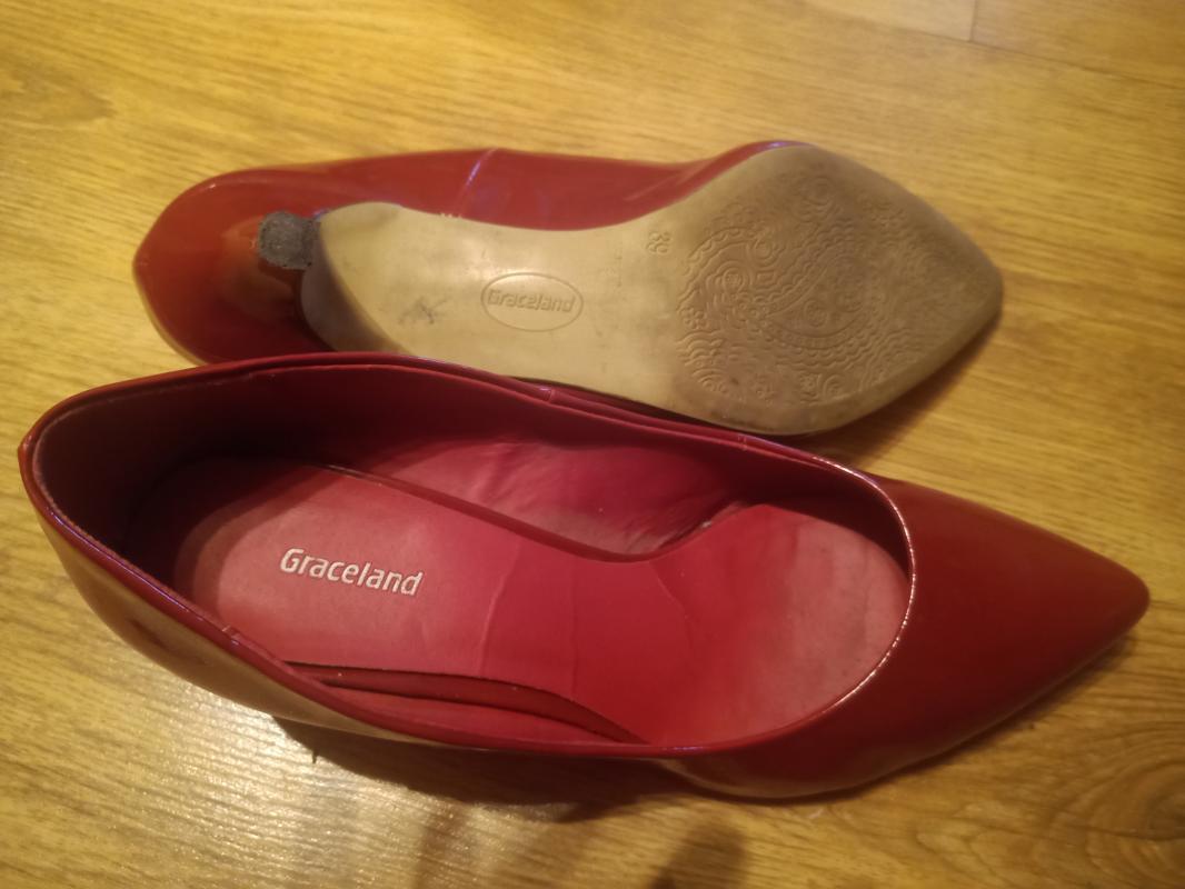 5) Bordowe lakierki szpilki firmy Graceland, obcas ok. 3 cm. Rozmiar 39, 6, 25 cm. Cena 10 zł.