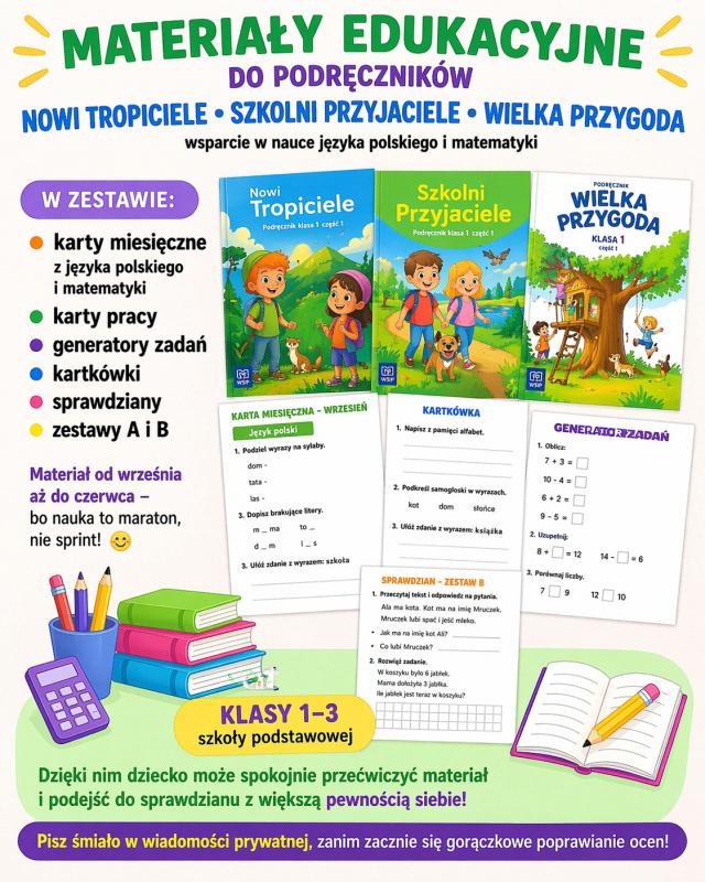 - karty miesięczne, generatory, kartkówki i sprawdziany z języka polskiego i matematyki